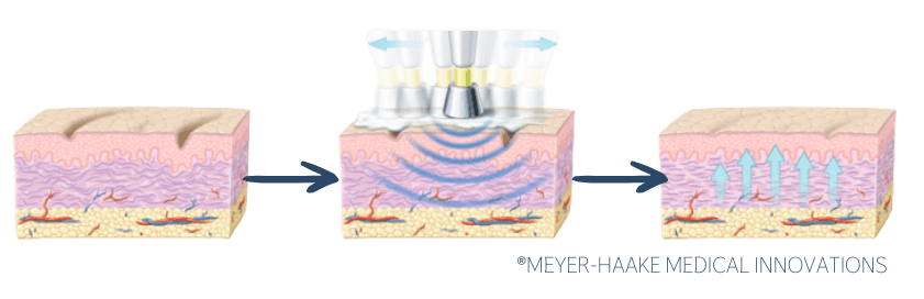 Die Energie der Radiowellen erreicht die Dermis und führt zu einer Verkürzung der zu lang gewordenen Strukturen. Mit sanfter Wärmeerzeugung und Stimulation der Fibroblasten in den tieferen Gewebeschichten wird die Neubildung von Collagen und Elastin angeregt. Ohne die Epidermis zu belasten, wird das Gewebe aus der Tiefe heraus gestrafft.